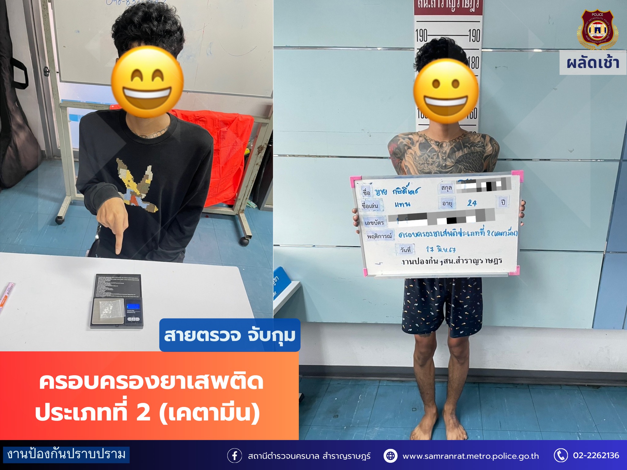 .ต.ท.ทนง เพียรสะอาด สวป.สน.สำราญราษฎร์ (สำราญ 2-1) พร้อมเจ้าหน้าที่สายตรวจ ได้ร่วมจับกุม นาย กษิดิ์เดช *** อายุ 24 ปี ที่อยู่ ถ.พรานนก แขวง ช่างทองหล่อ เขต บางกอกน้อย กทม ข้อหาความผิด : ครอบครองยาเสพติดให้โทษประเภทที่ 2 (เคตามีน)