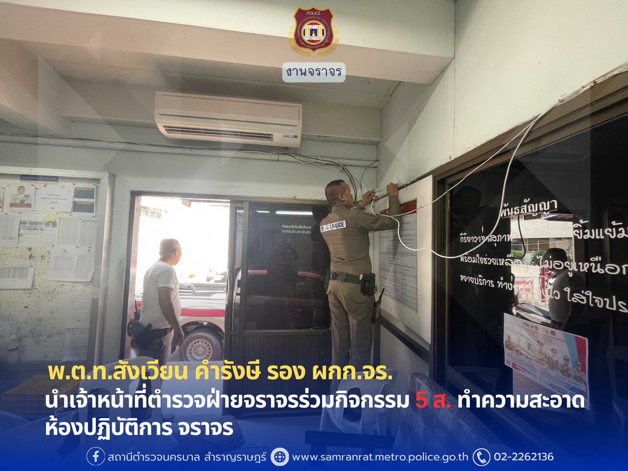 พ.ต.ท.สังเวียน คำรังษี รอง ผกก.จร.ฯ (สำราญ 6) นำเจ้าหน้าที่ตำรวจฝ่ายจราจรร่วมกิจกรรม 5 ส. ทำความสะอาด ห้องปฏิบัติการ จราจร