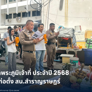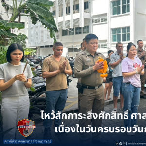 วันที่ 3 สิงหาคม 2568 เวลา 10.00 น. พ.ต.อ.ประสิทธิ์ วิรัตยาภรณ์ ผกก.สน.สำราญราษฎร์ พร้อมด้วยข้าราชการตำรวจ สน.สำราญราษฎร์ ไหว้สักการะสิ่งศักสิทธิ์ ศาลพระภูมิเจ้าที่ ประจำปี 2568 และเนื่องในวันครบรอบวันก่อตั้ง สน.สำราญราษฎร์ ปีนี้ครบ 135 ปี