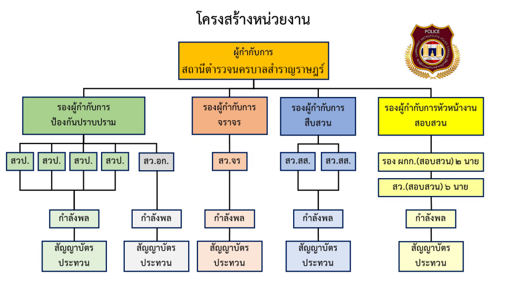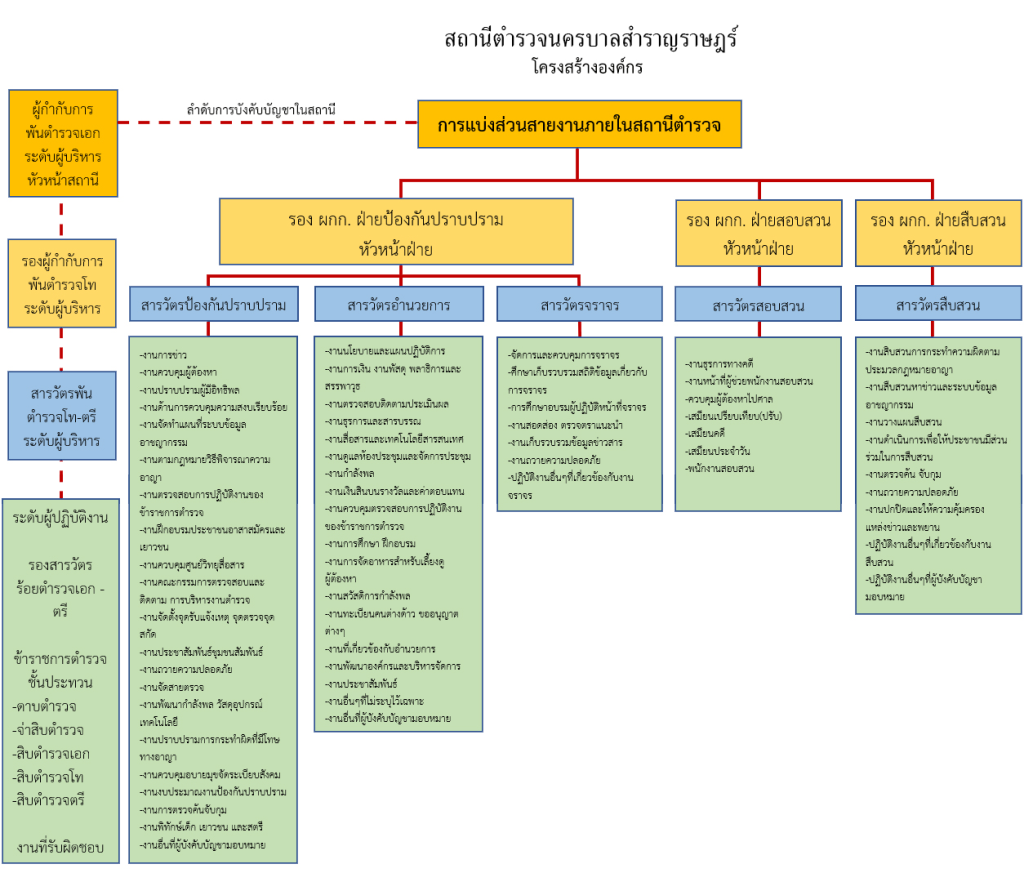 มีหน้าที่เกี่ยวกับการอำนวยการ การวางแผน การตรวจสอบติดตามและประเมินผลงานที่เกี่ยวกับนโยบาย ยุทธศาสตร์ และแผนงานของสถานีตำรวจ งานการบริหารบุคลากร งานจเรตำรวจ งานกิจการพิเศษ งานความมั่นคง การศึกษาการฝึกอบรม งานวิชาการ สวัสดิการ การพัฒนา การบริหารจัดการ งบประมาณ การเงิน การพัสดุ การพลาธิการและ สรรพวุธ การส่งกำลังบำรุง รวมทั้งลักษณะงานอื่นๆ ที่เกี่ยวข้องหรือเป็นส่วนประกอบของงานดังกล่าว เพื่อส่งเสริมหรือสนับสนุนการปฏิบัติงานของสถานีตำรวจ