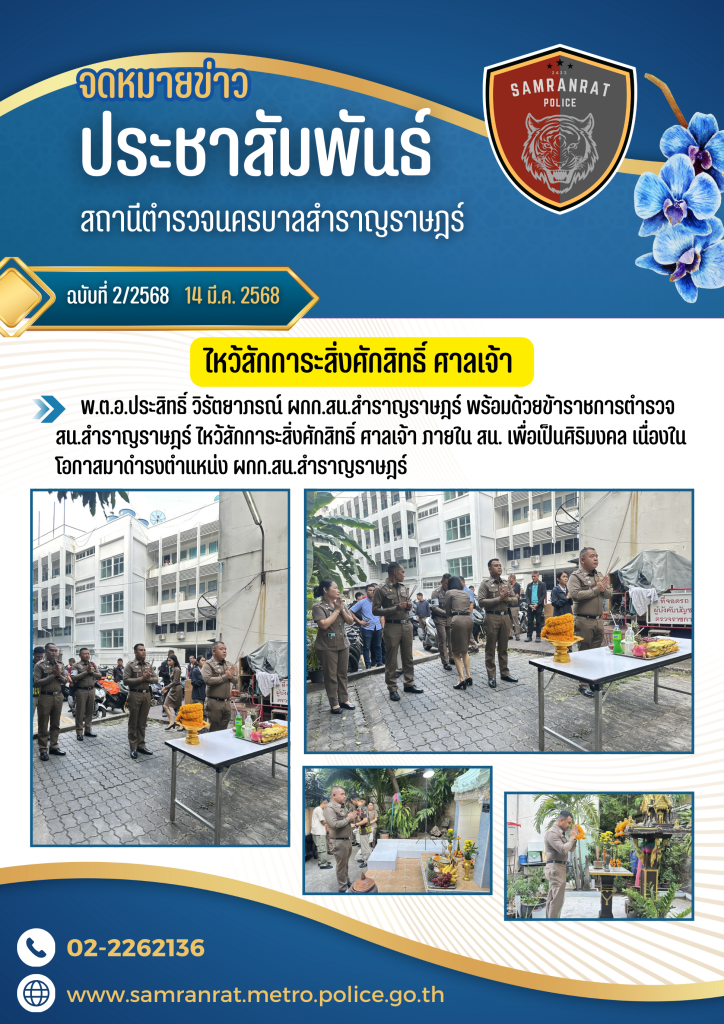 พ.ต.อ.ประสิทธิ์ วิรัตยาภรณ์ ผกก.สน.สำราญราษฎร์ พร้อมด้วยข้าราชการตำรวจ สน.สำราญราษฎร์ ไหว้สักการะสิ่งศักสิทธิ์ ศาลเจ้า ภายใน สน. เพื่อเป็นศิริมงคล เนื่องในโอกาสมาดำรงตำแหน่ง ผกก.สน.สำราญราษฎร์