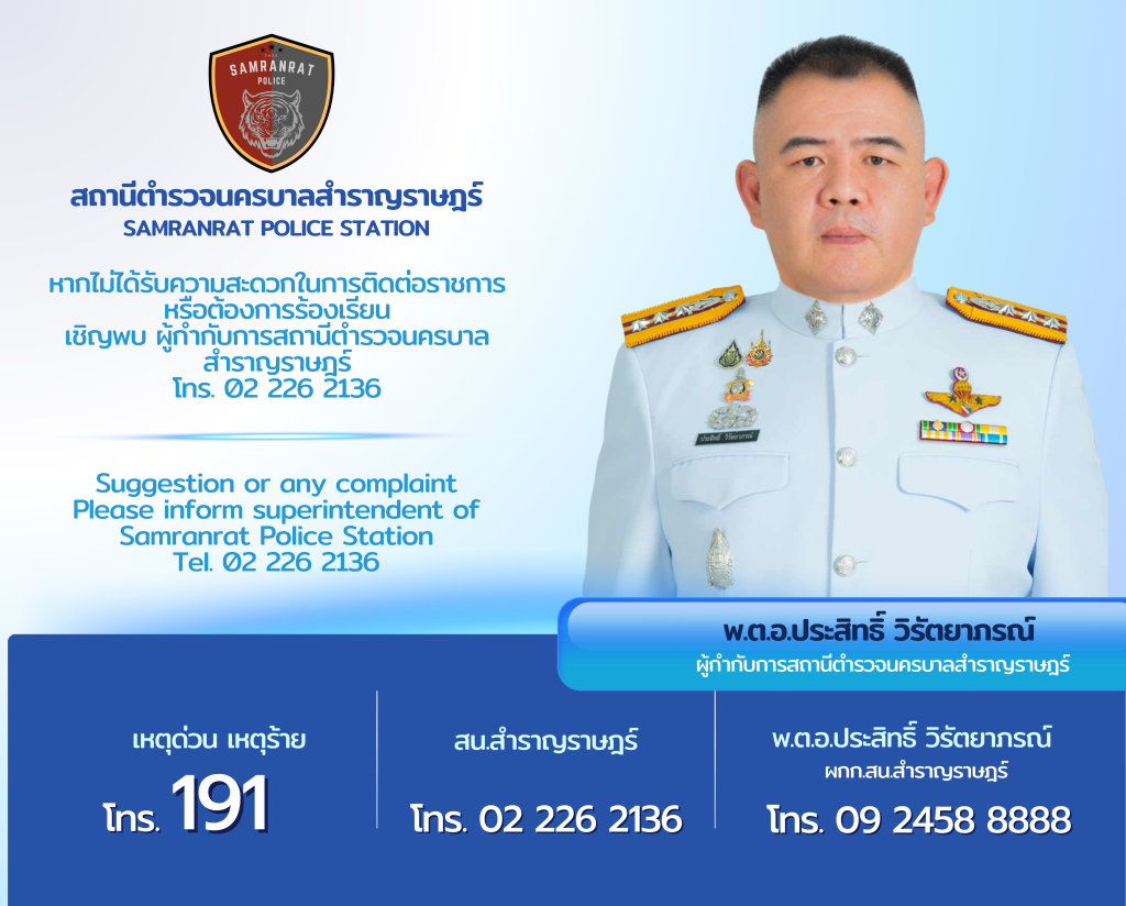 - ทาง Email สถานีตำรวจนครบาลสำราญราษฎร์ : samranrat@royalthaipolice.go.th